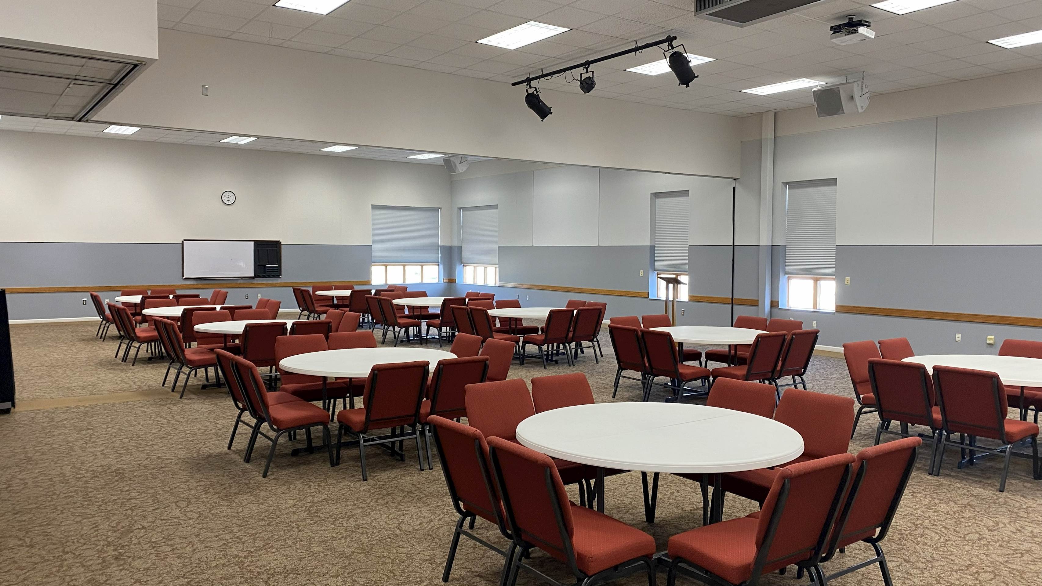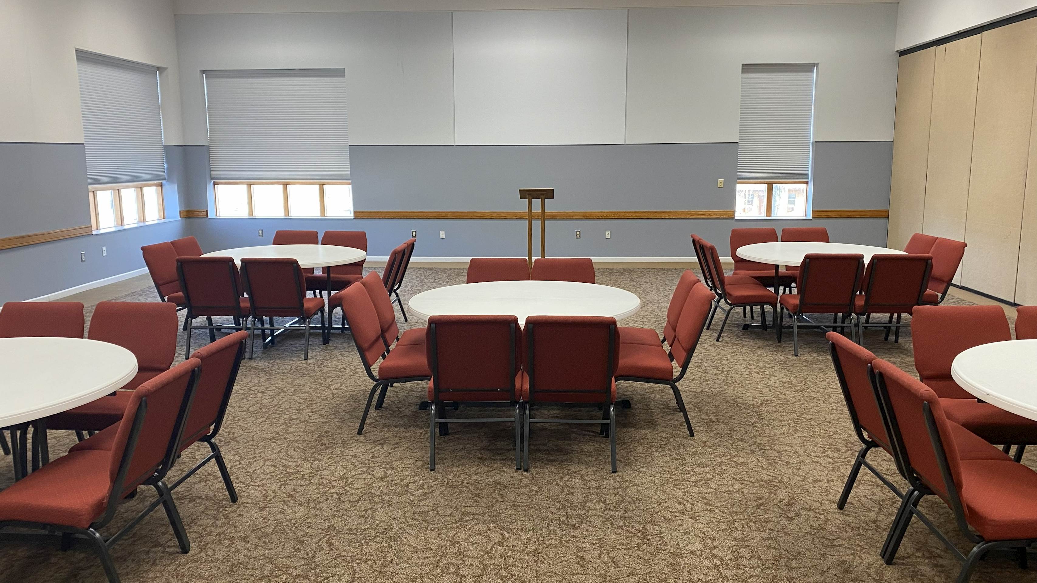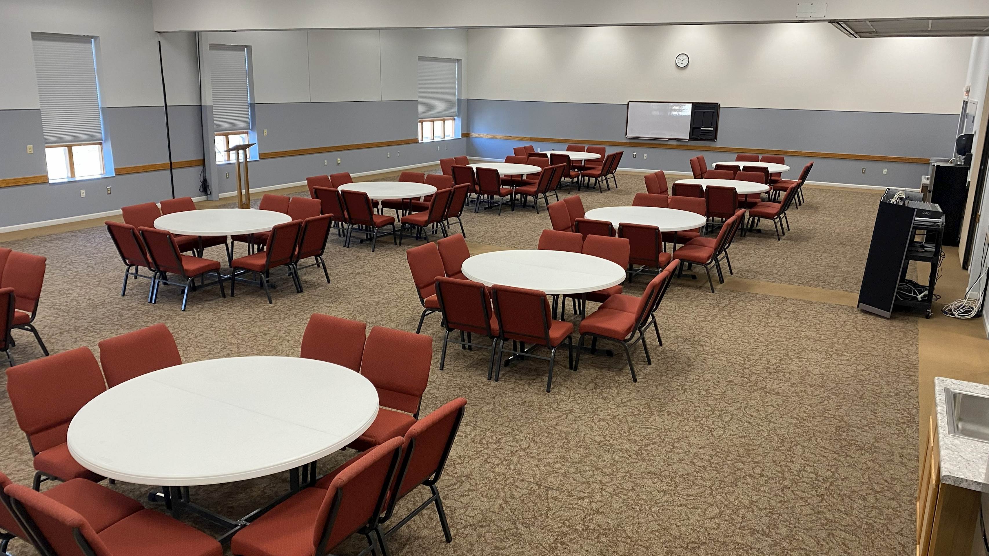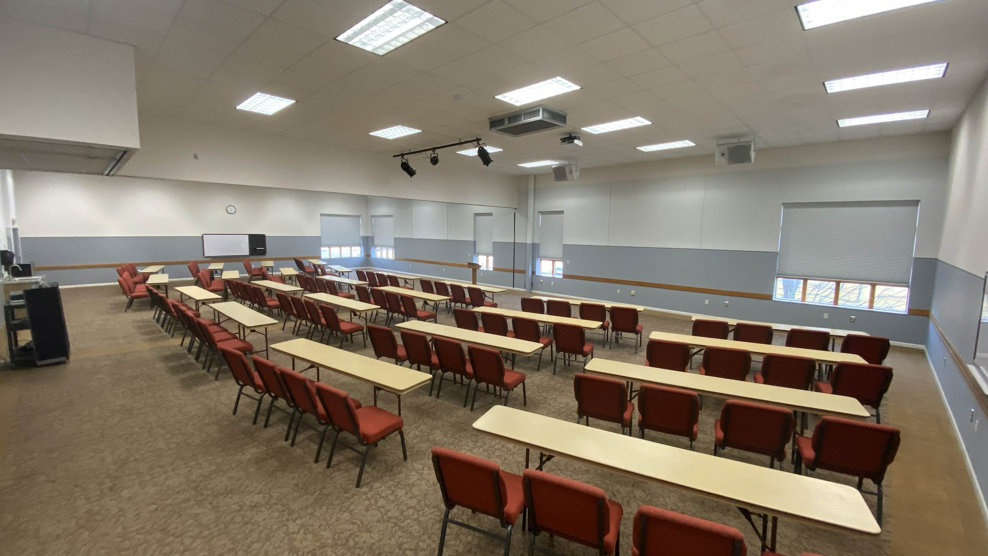 The Grant Room is located downstairs near the Connections Cafe in the Activities Center building. This beautiful space has a wall of windows allowing natural light to fill the space. A short counter top, sink, and refrigerator are located in the back of the room. This space also offers two wall-mounted televisions and a wall-mounted white board. Portable sound equipment is also available.