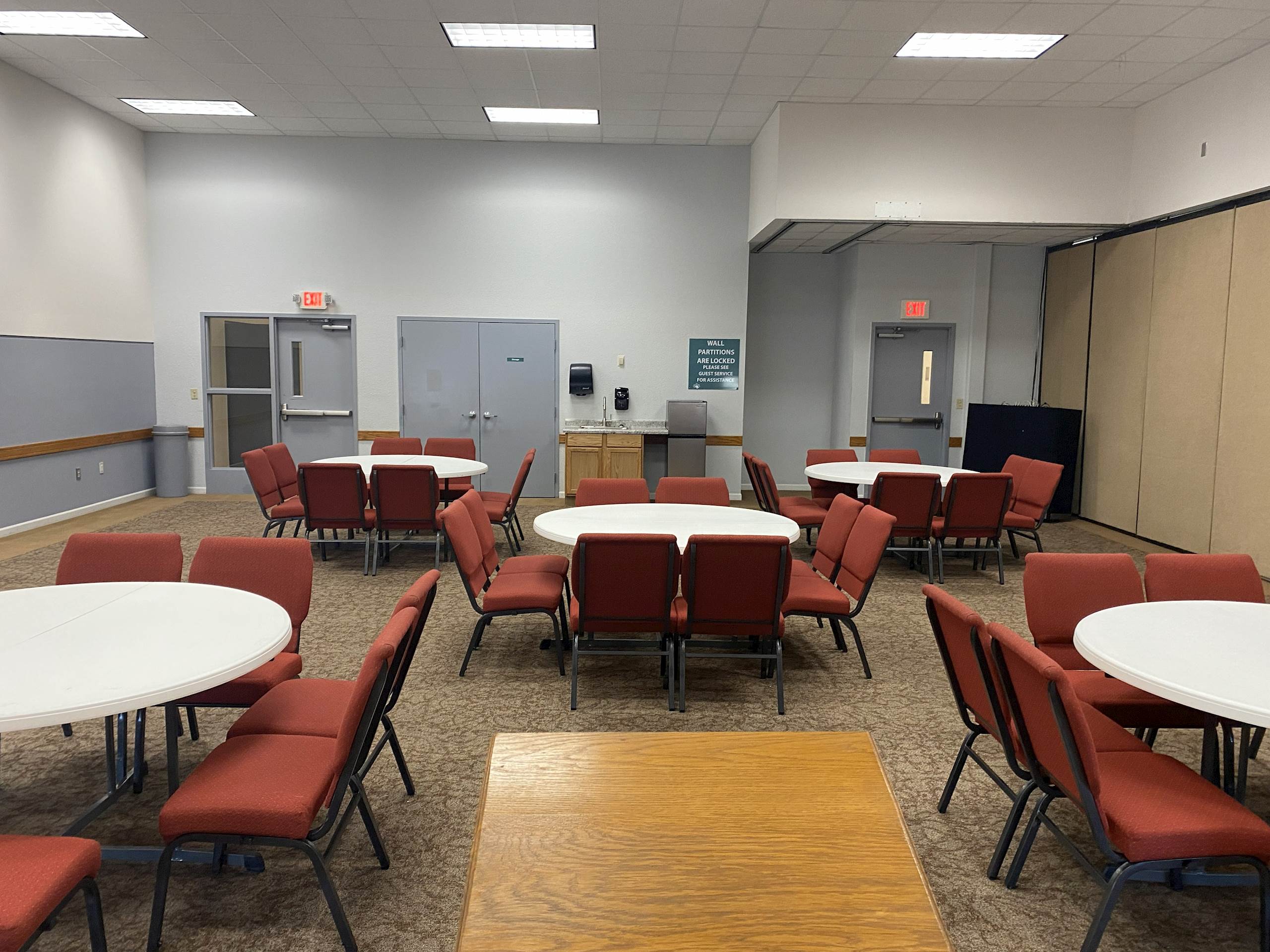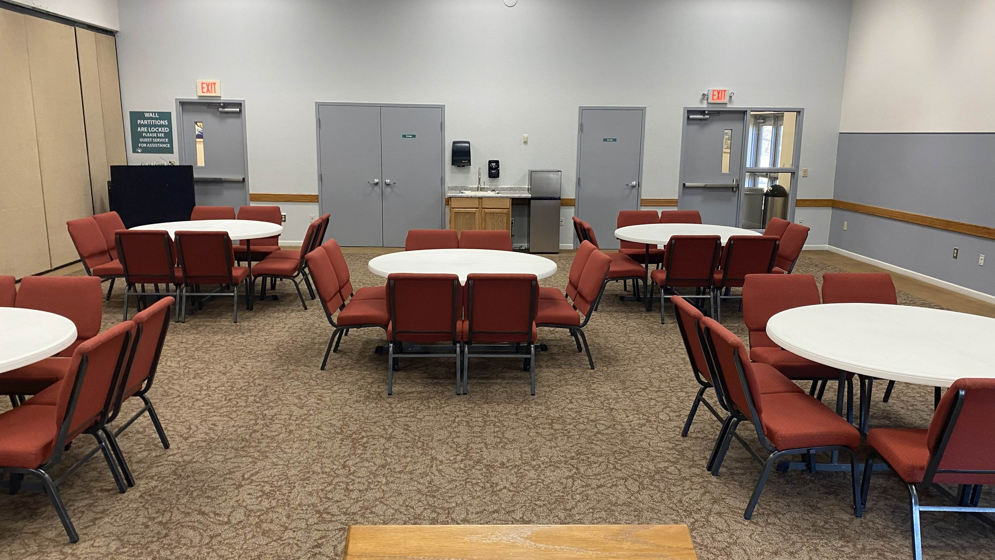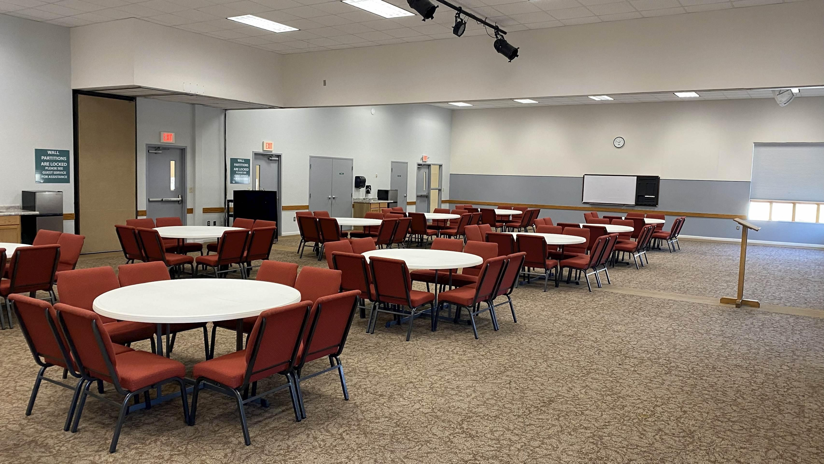 The Grant Room is located downstairs near the Connections Cafe in the Activities Center building. This beautiful space has a wall of windows allowing natural light to fill the space. A short counter top, sink, and refrigerator are located in the back of the room. This space also offers two wall-mounted televisions and a wall-mounted white board. Portable sound equipment is also available.