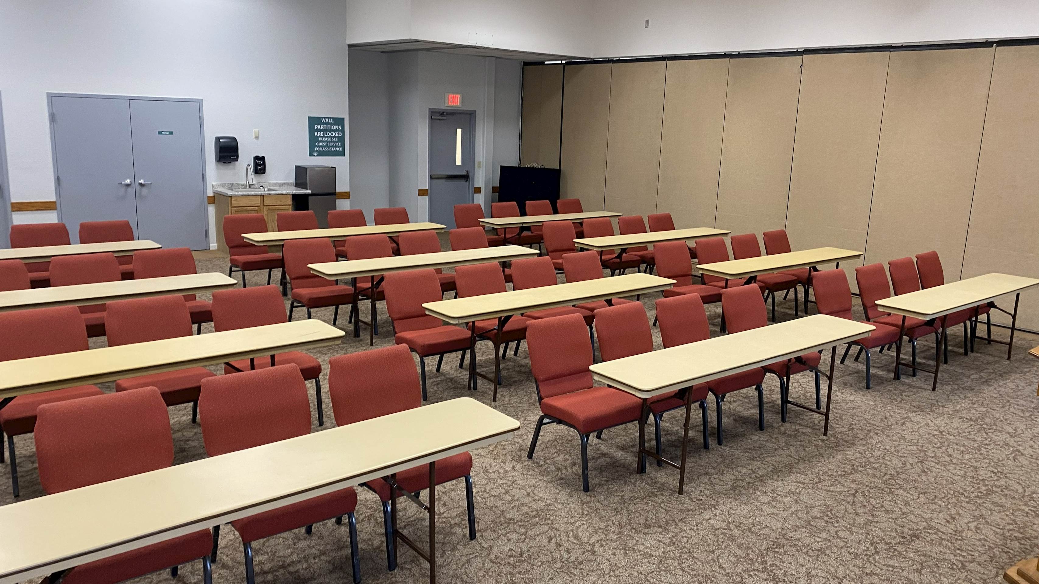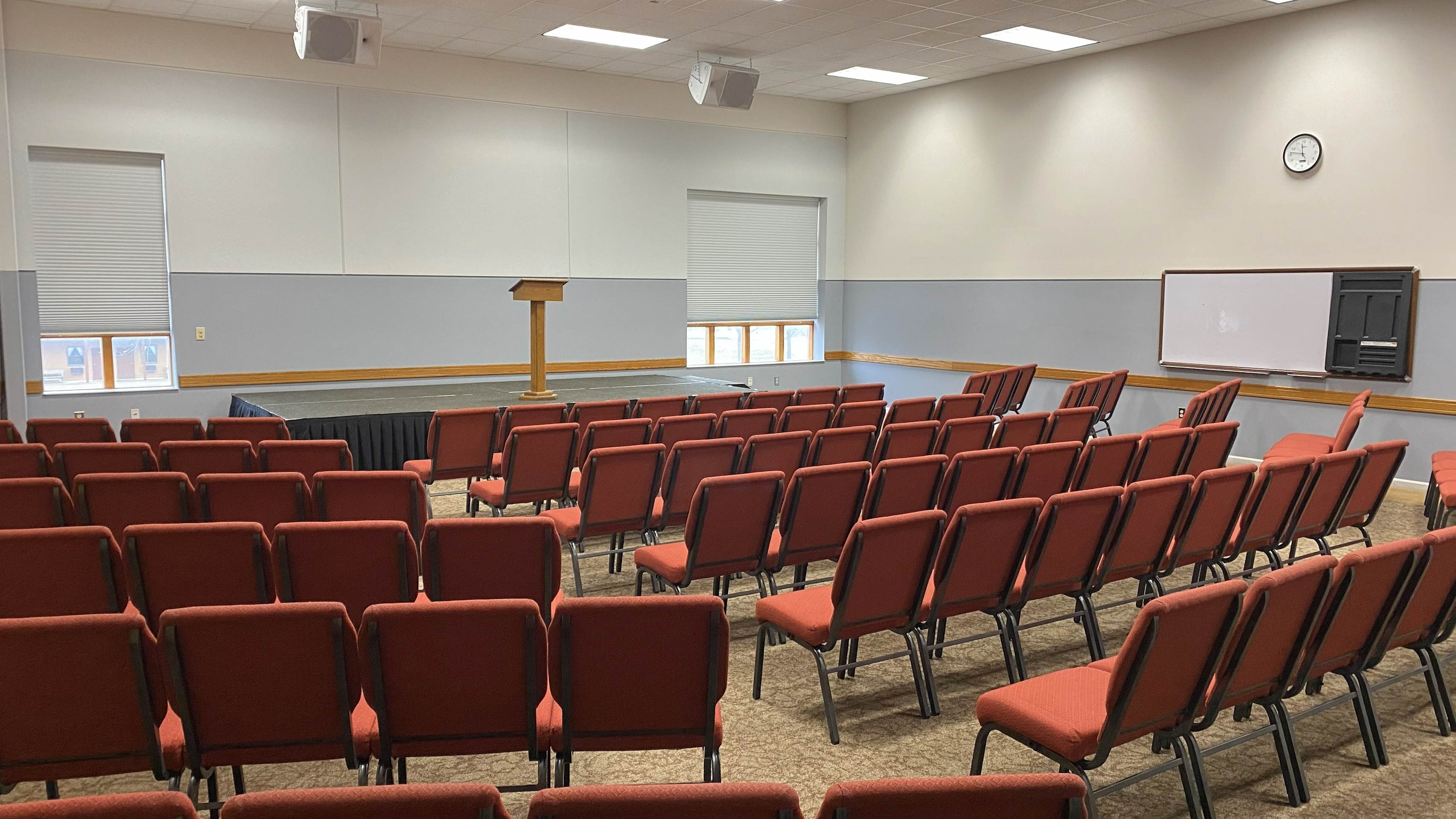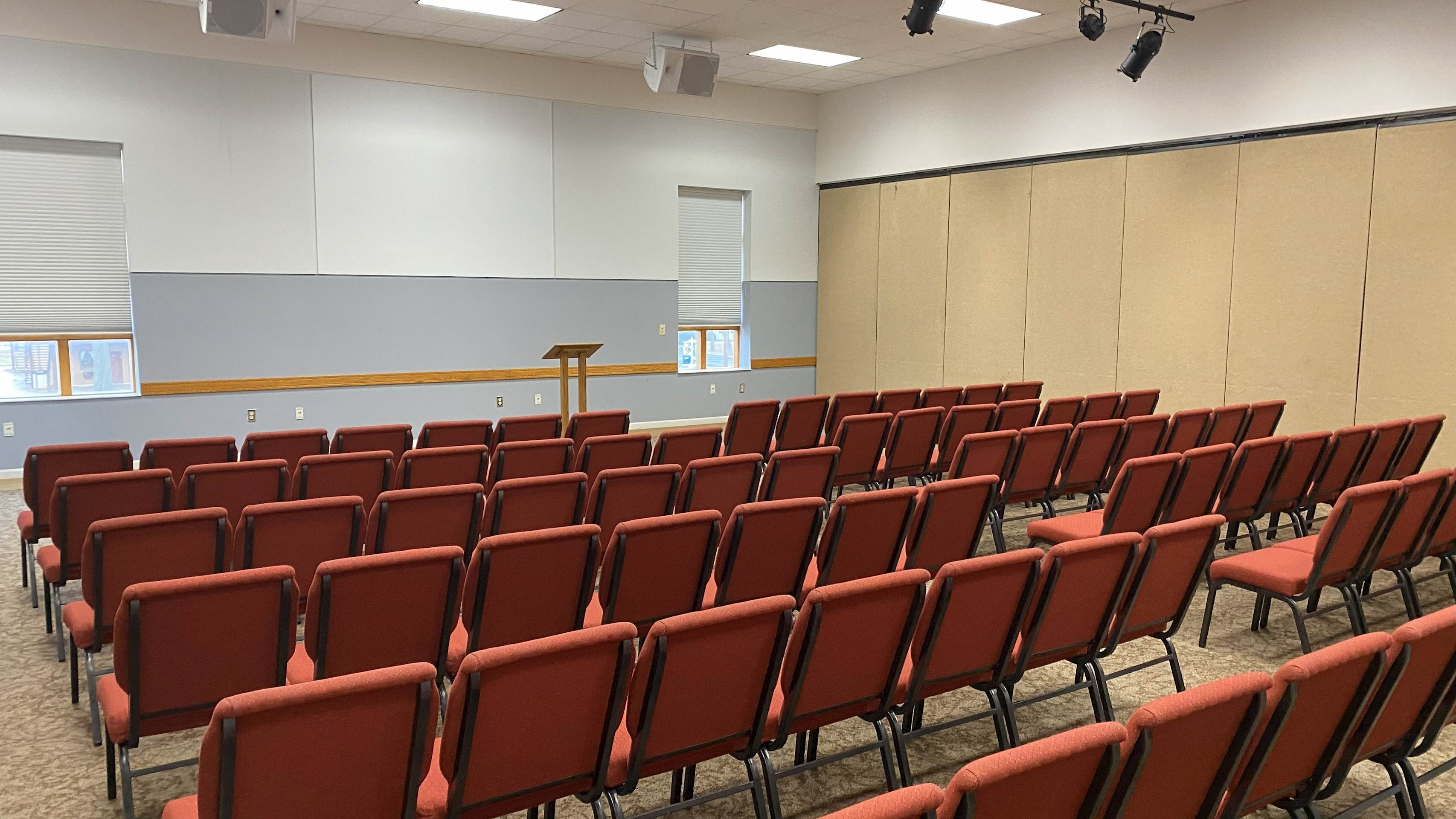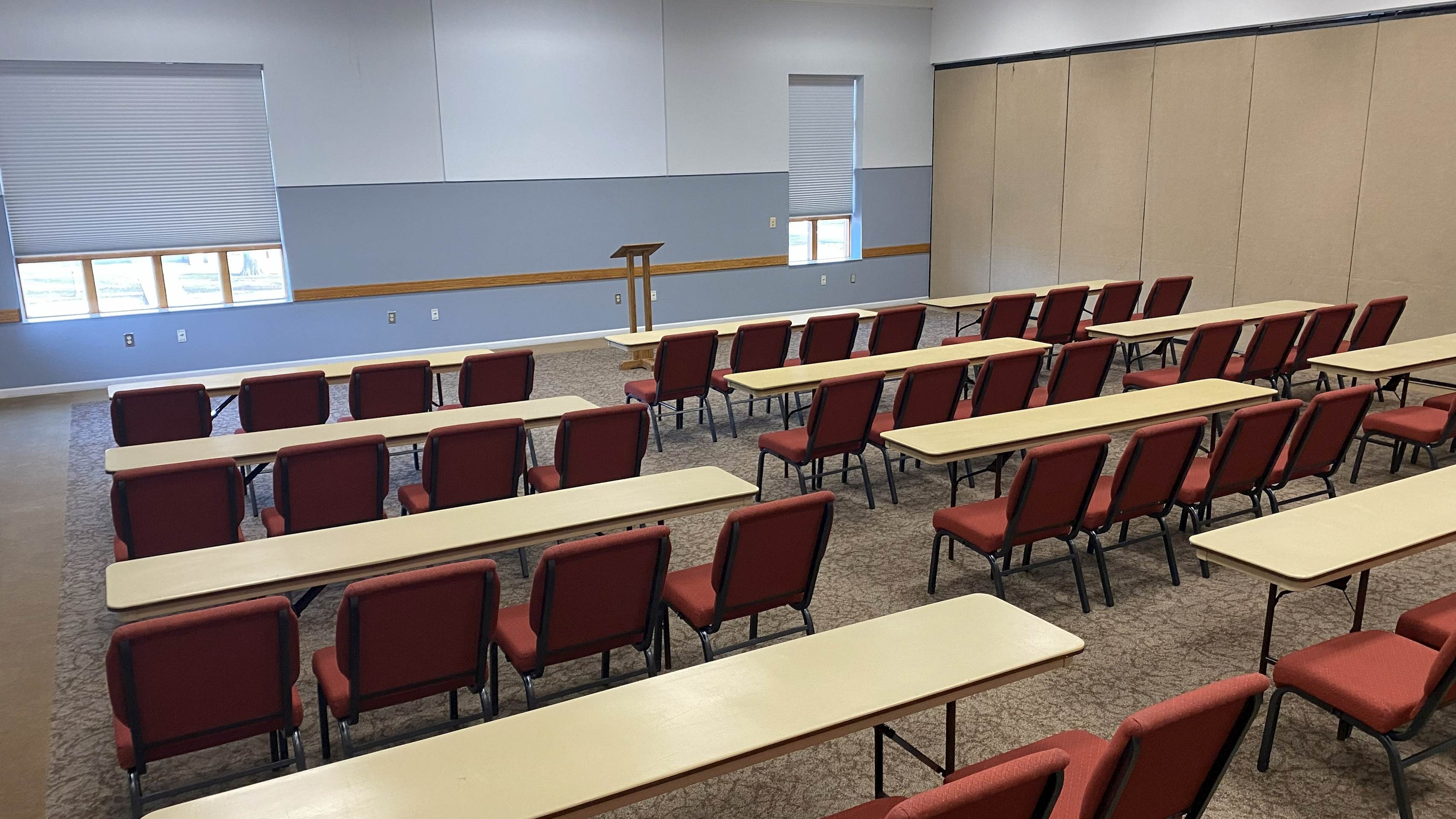 The Grant Room is located downstairs near the Connections Cafe in the Activities Center building. This beautiful space has a wall of windows allowing natural light to fill the space. A short counter top, sink, and refrigerator are located in the back of the room. This space also offers two wall-mounted televisions and a wall-mounted white board. Portable sound equipment is also available.
