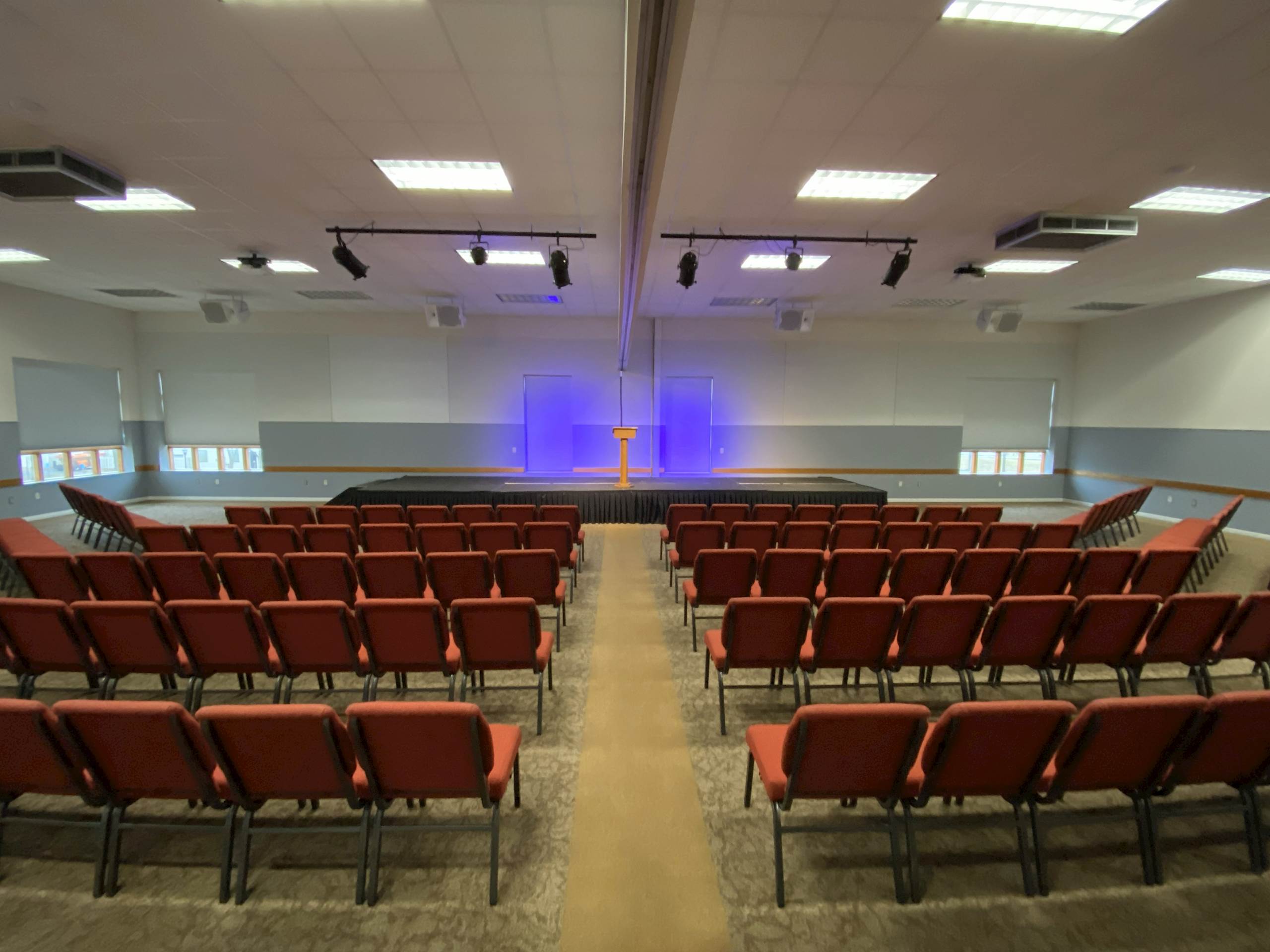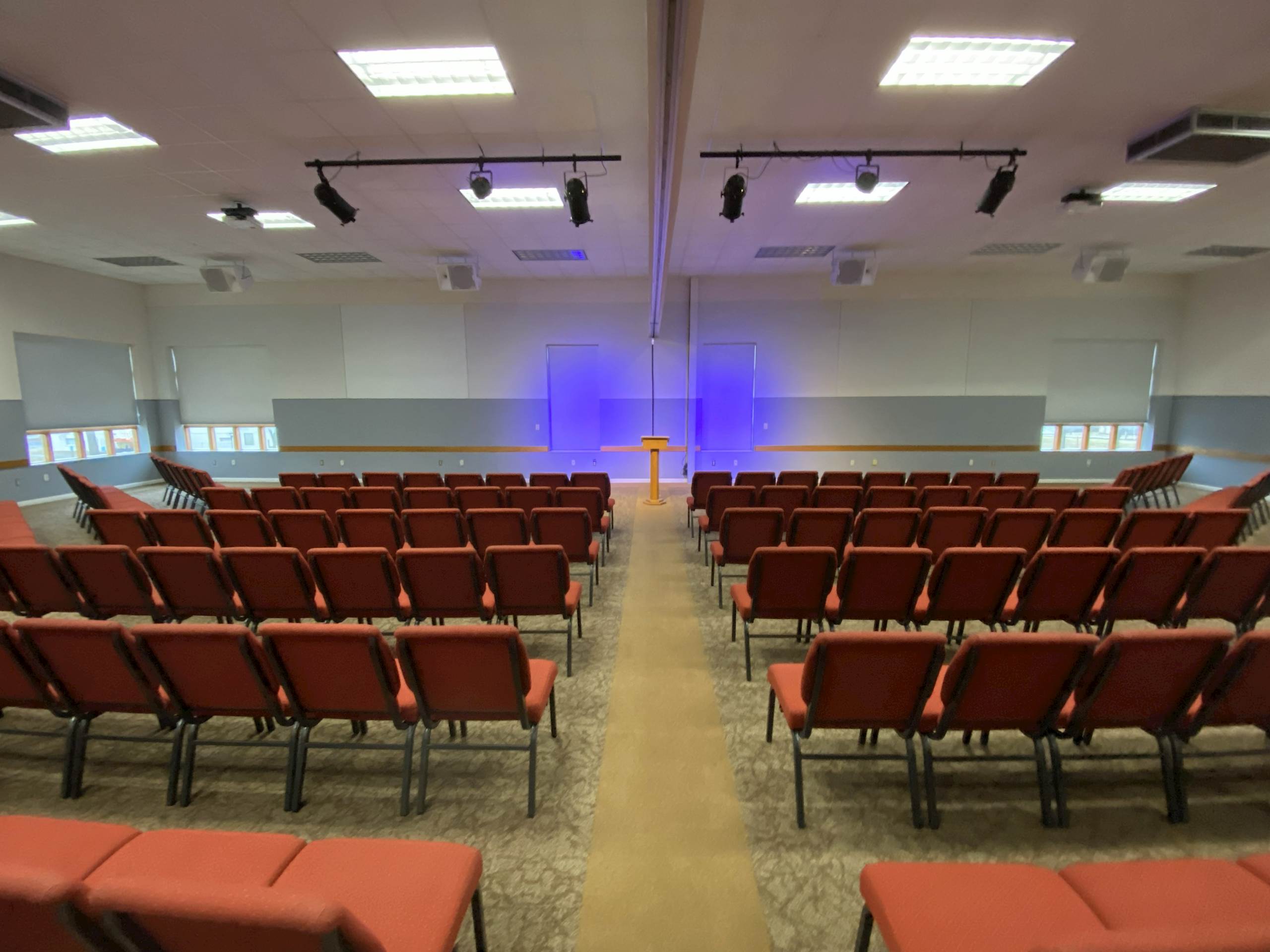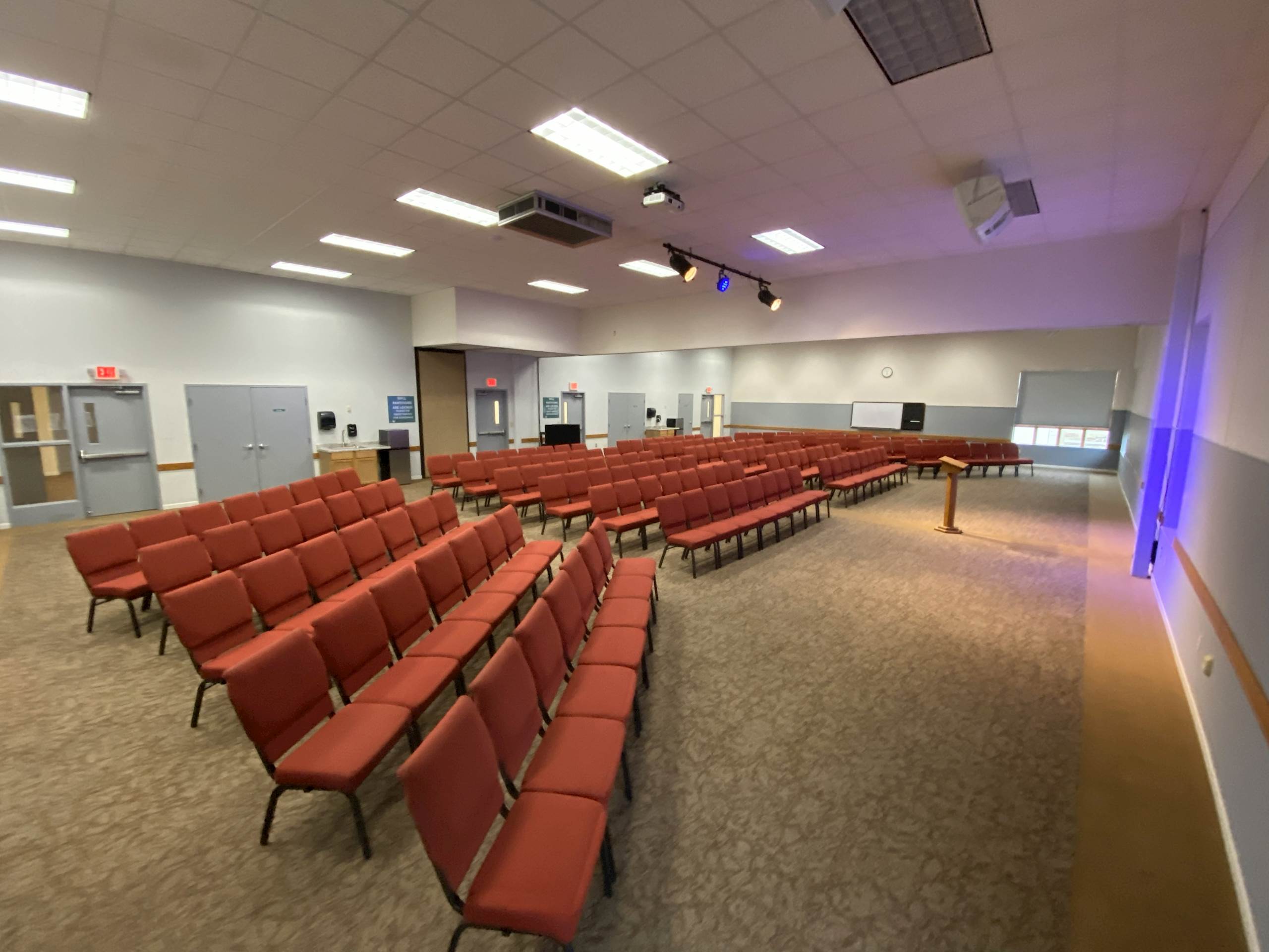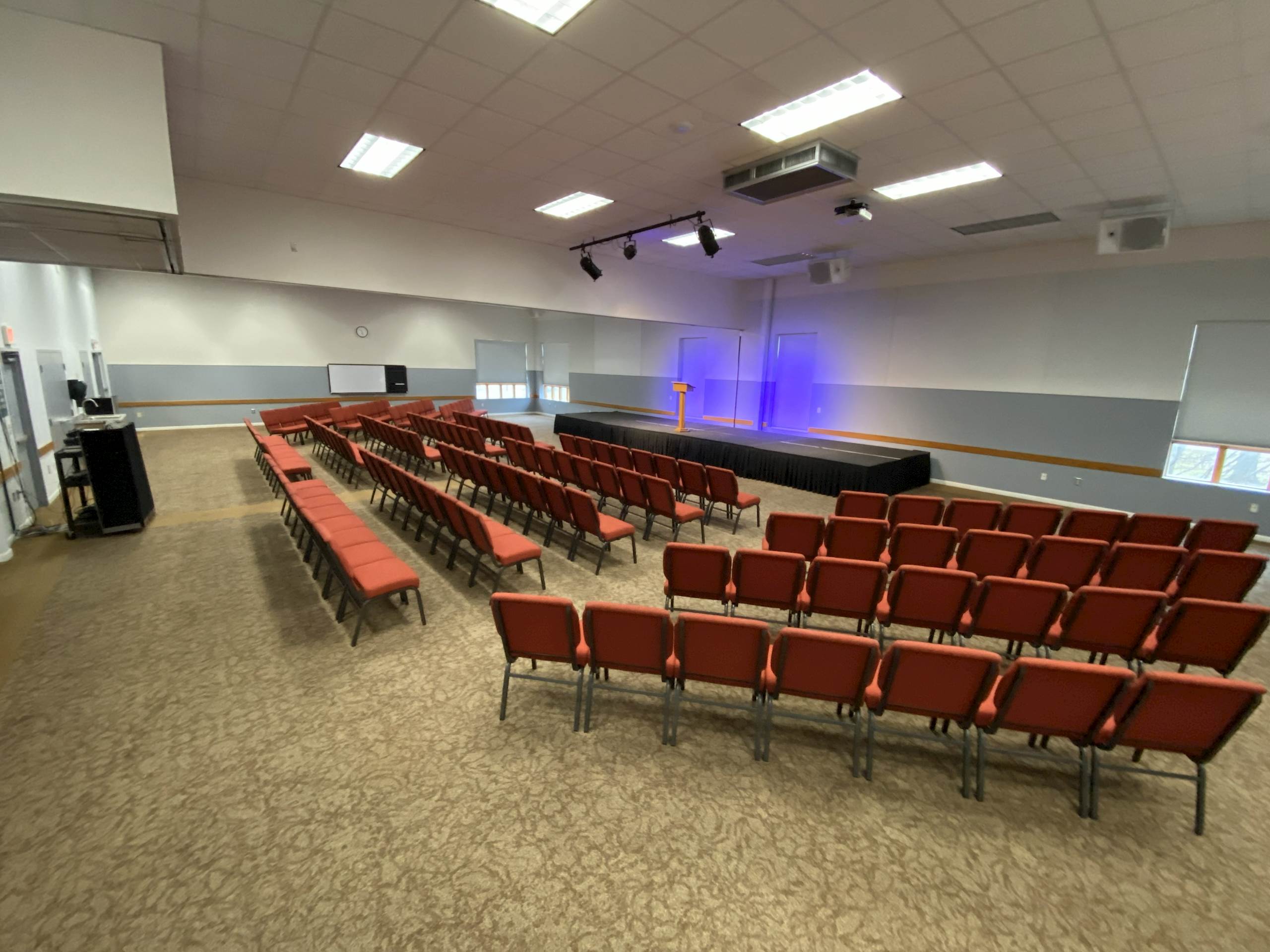 The Auditorium has a seating capacity of 1500 people; Lake Williamson’s largest meeting space. This space is very versatile with various chair/table and wall section combinations. Wall sections can be moved to offer the room divided down the middle as two rooms or with six breakout rooms (three on each side) with a long rectangular room in the center. There is also a newly built foyer, great for socializing between meetings or displaying exhibitors. Off the foyer is A7, which can hold up to 80 guests. A7 offers its own lavatory, counter top with sink and coffee maker, two wall mounted televisions, and a variety of seating styles. This space makes for a great camp office or child care room. The Auditorium is equipped with a booming sound system, stage lights, two platform televisions, two projectors and screens, and a lot of opportunity for creativity.