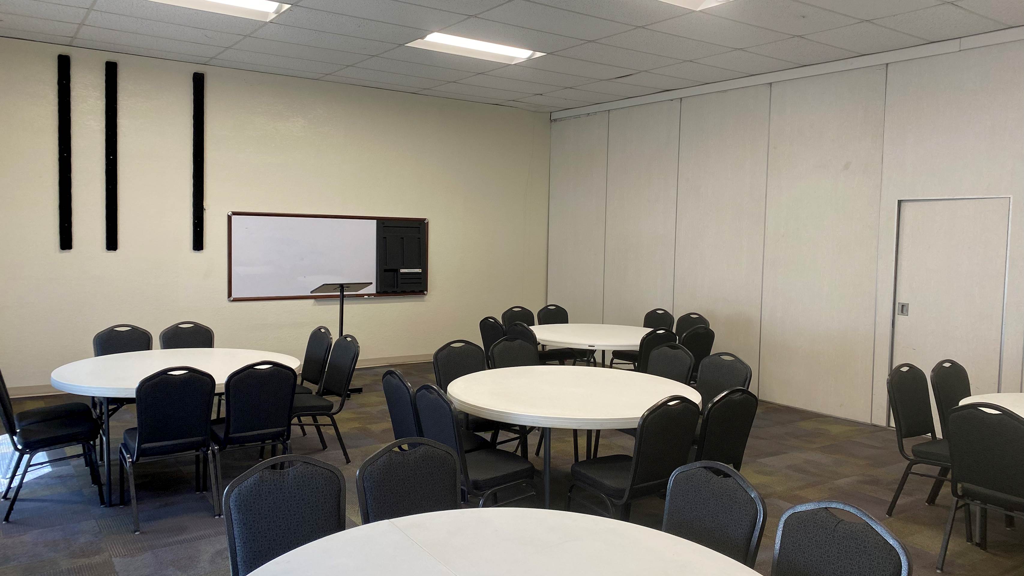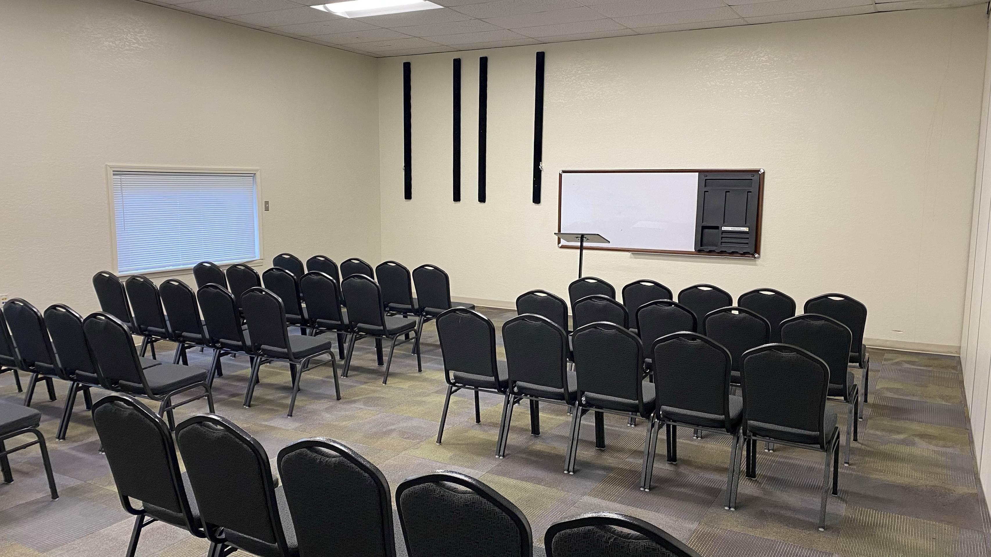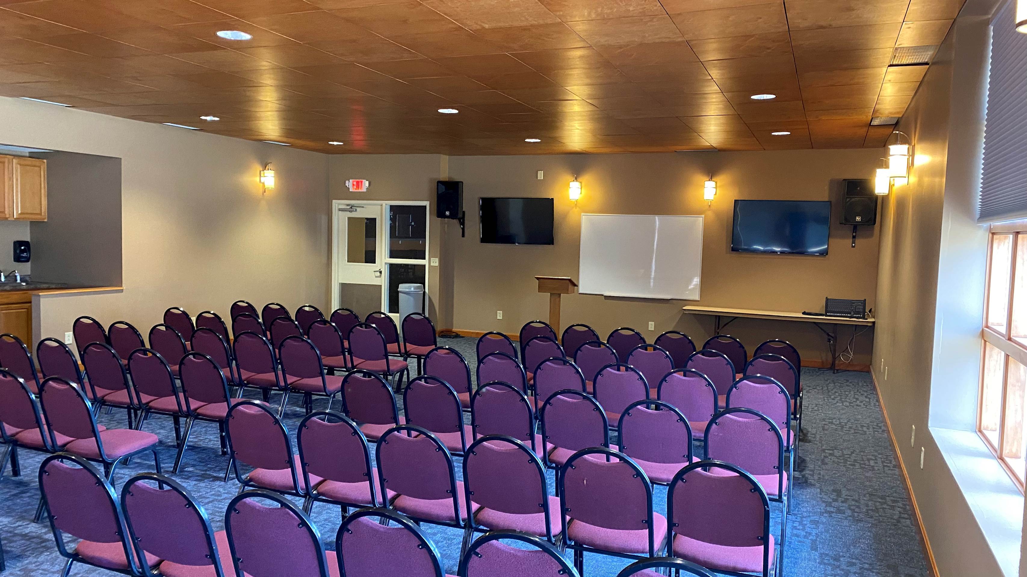 The Grant Room is located downstairs near the Connections Cafe in the Activities Center building. This beautiful space has a wall of windows allowing natural light to fill the space. A short counter top, sink, and refrigerator are located in the back of the room. This space also offers two wall-mounted televisions and a wall-mounted white board. Portable sound equipment is also available.