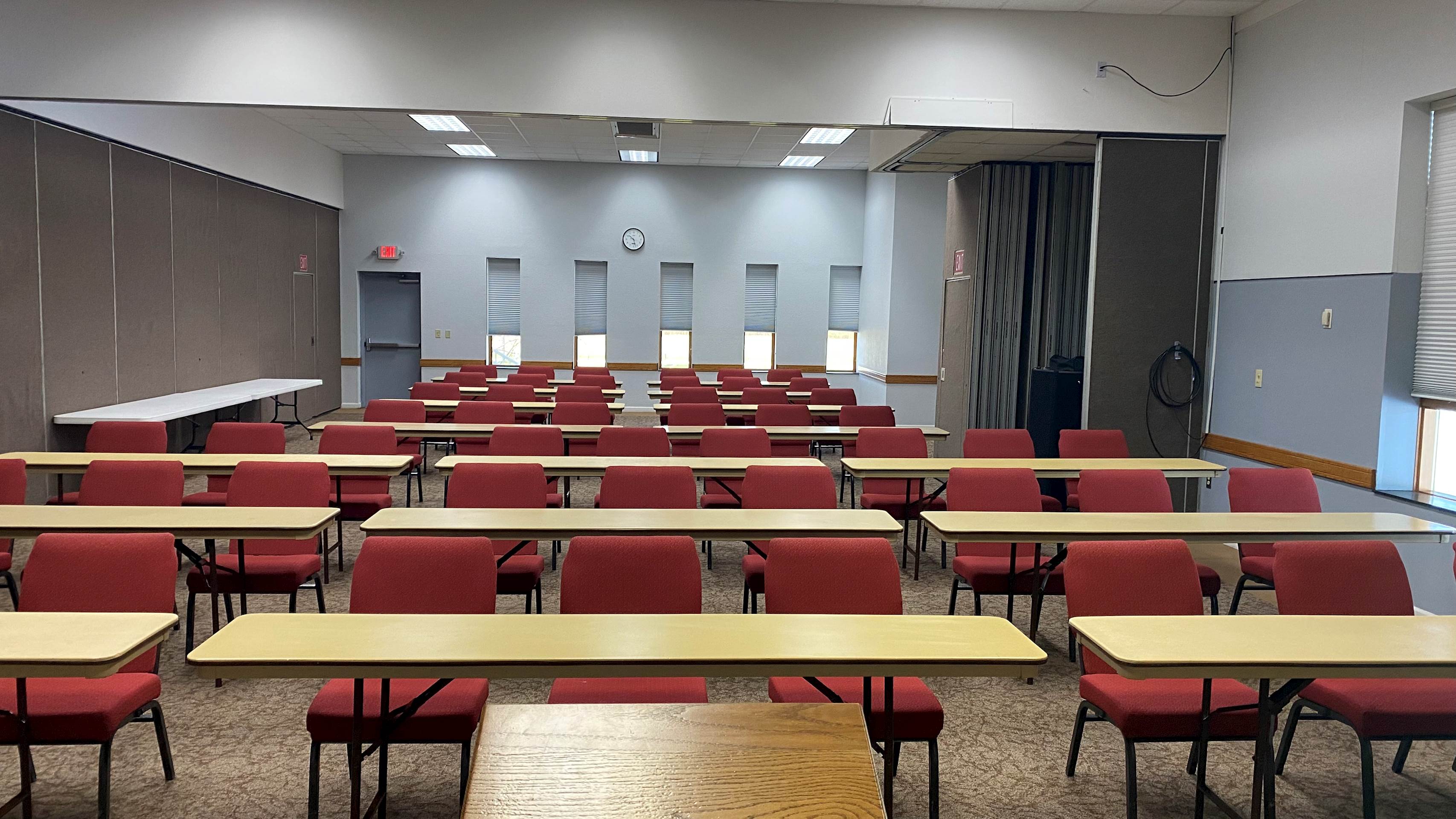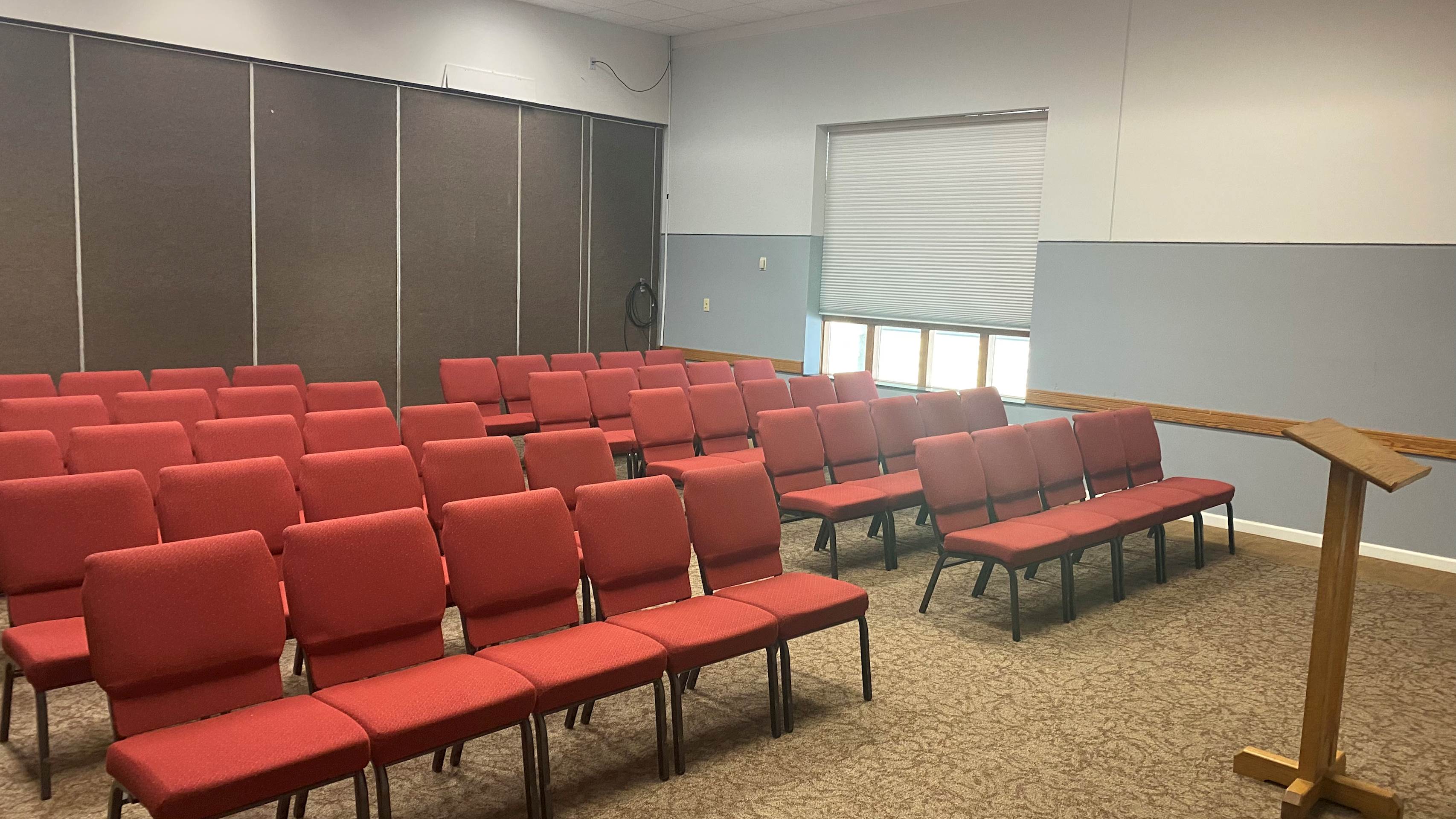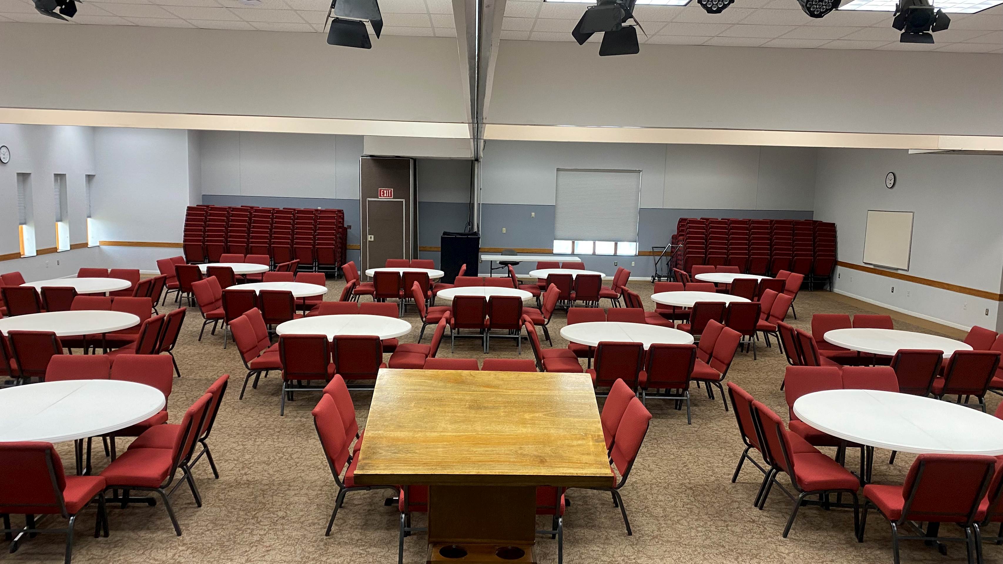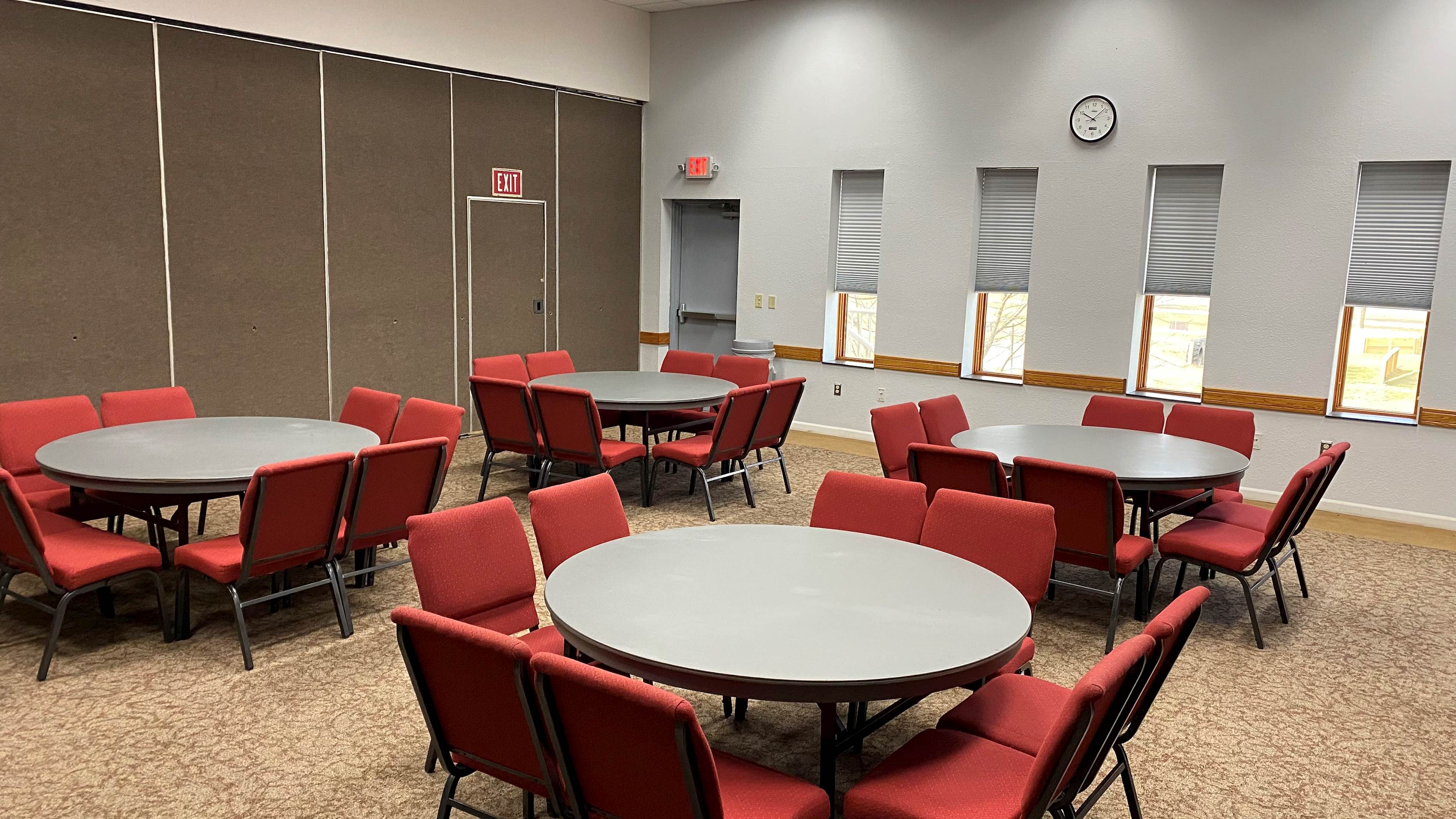 The Grant Room is located downstairs near the Connections Cafe in the Activities Center building. This beautiful space has a wall of windows allowing natural light to fill the space. A short counter top, sink, and refrigerator are located in the back of the room. This space also offers two wall-mounted televisions and a wall-mounted white board. Portable sound equipment is also available.