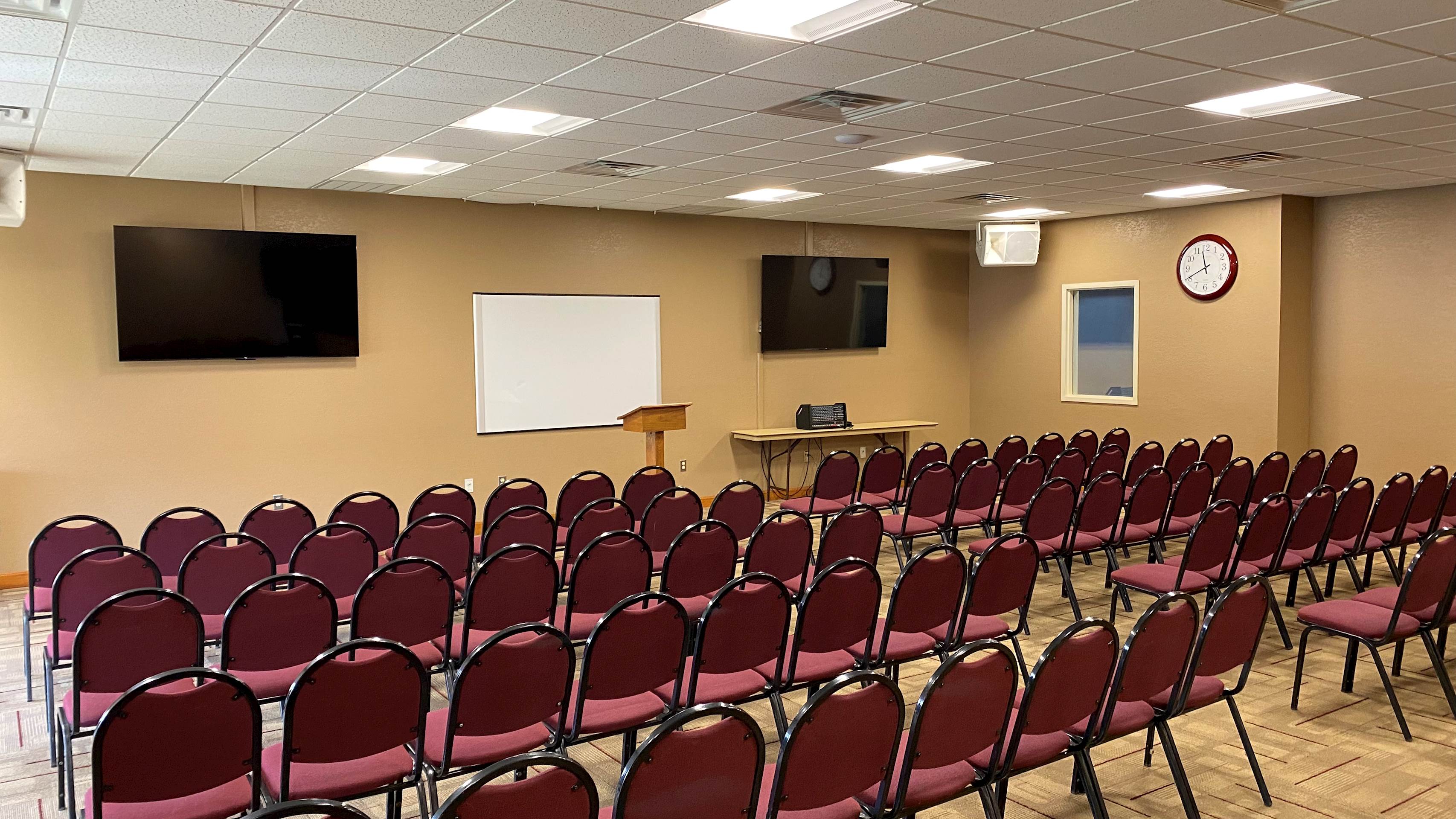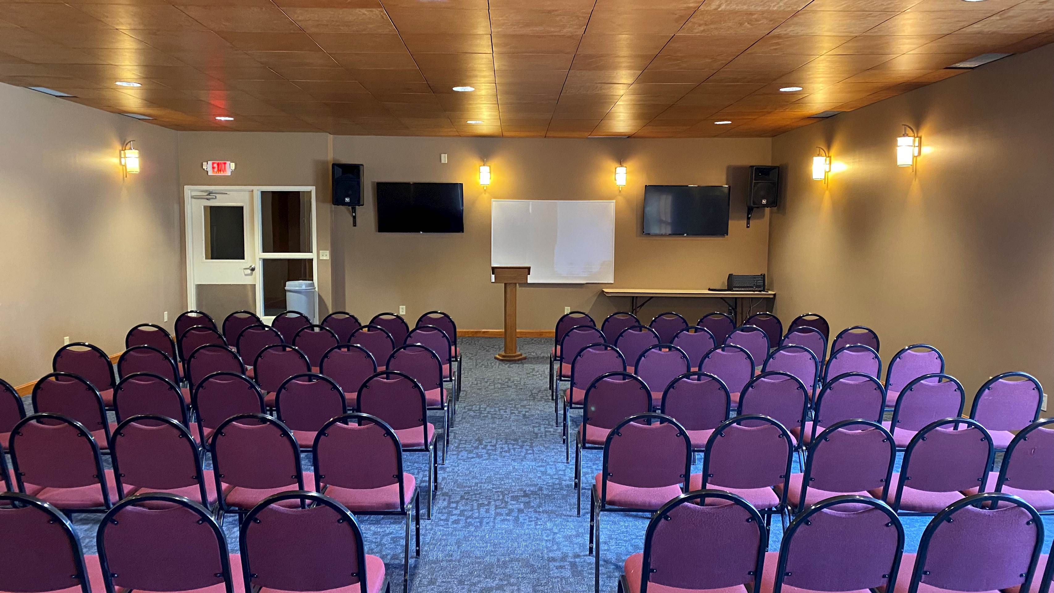 The Lincoln Room is located downstairs near the Connections Cafe in the Activities Center building. This beautiful space has a wall of windows allowing natural light to fill the space. A short counter top, sink, and refrigerator are located in the back of the room. This space also offers two wall-mounted televisions and a wall-mounted white board. Portable sound equipment is also available.