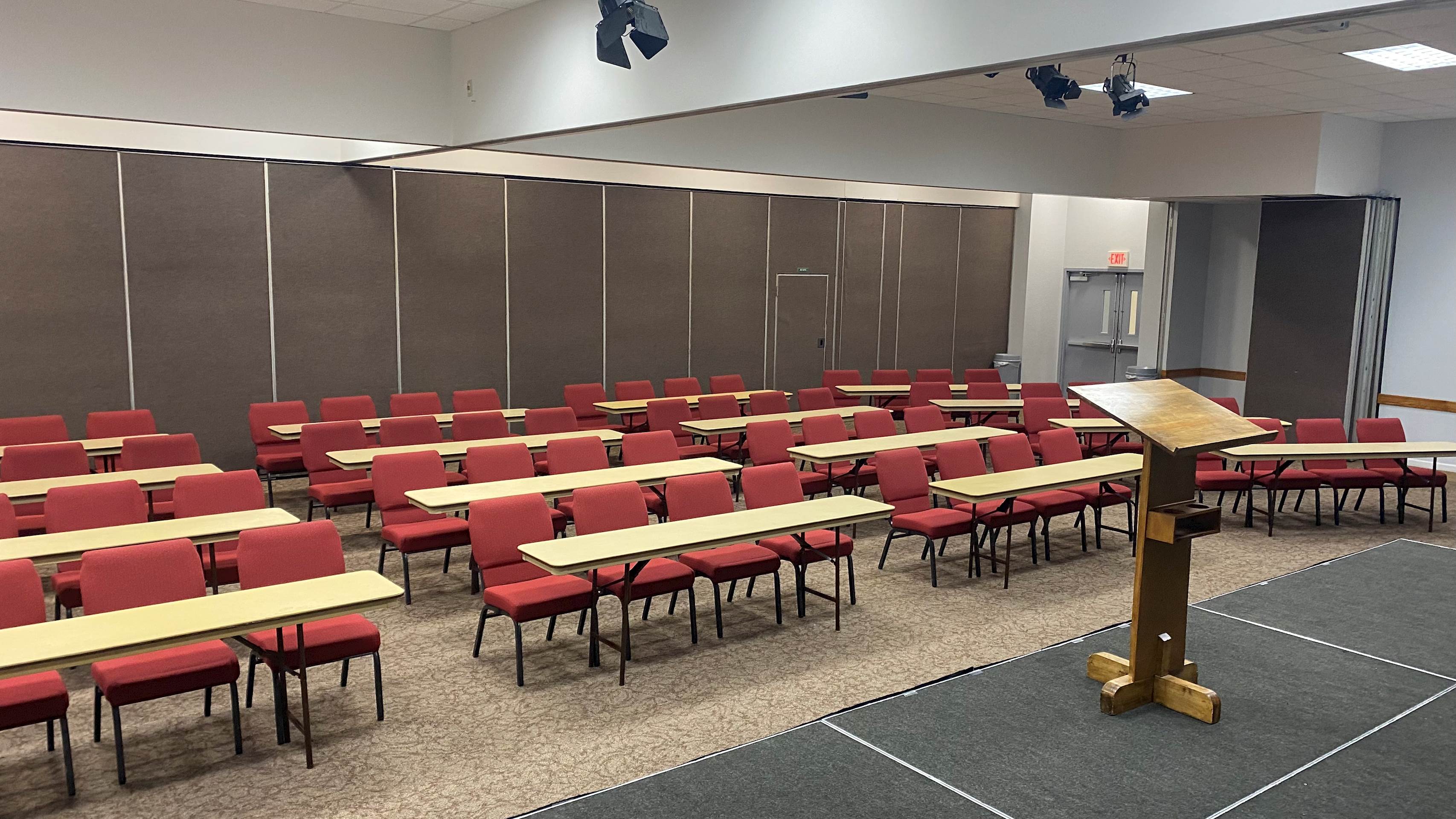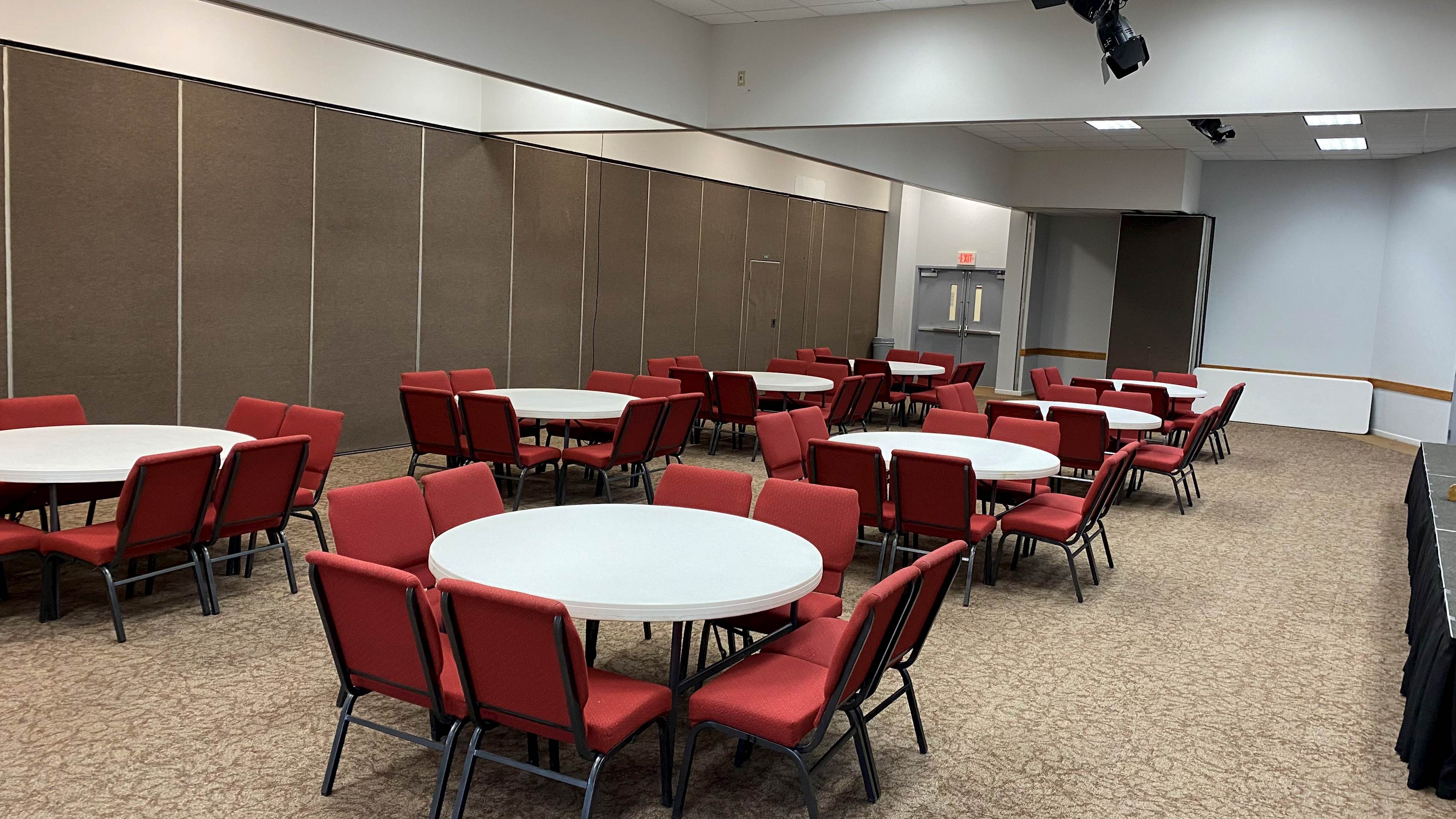 AC 207 is located upstairs in the newest addition to the Activities Center. This well-rounded meeting space offers groups a ton of flexibility and can be configured to meet a variety of needs. Wall sections can divide the room into four smaller rooms with a hallway down the middle, or a combination of two smaller rooms and one larger room. AC 207 is equipped with a sound system, stage lights, two projectors and screens, and a lot of opportunity for creativity.