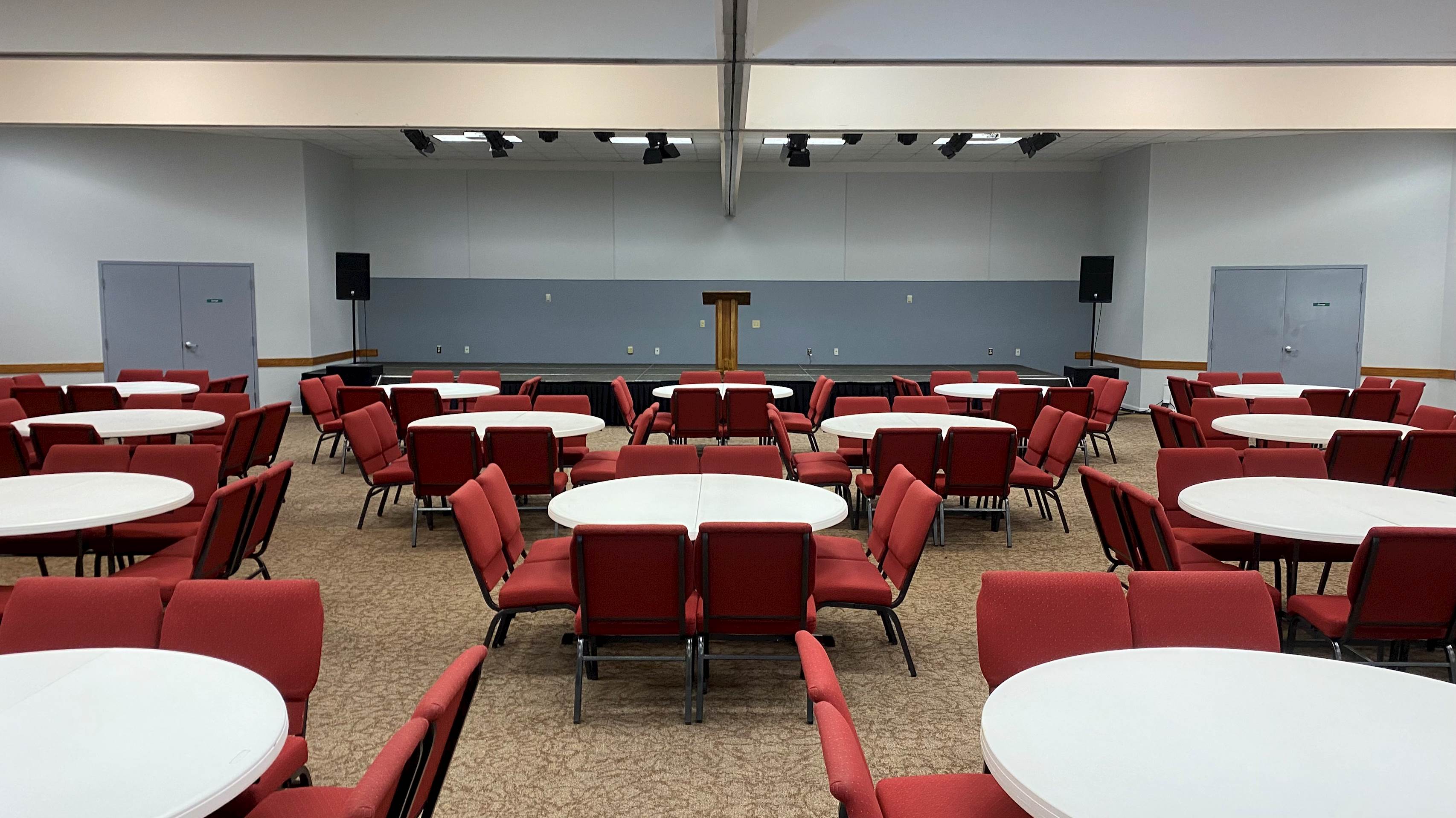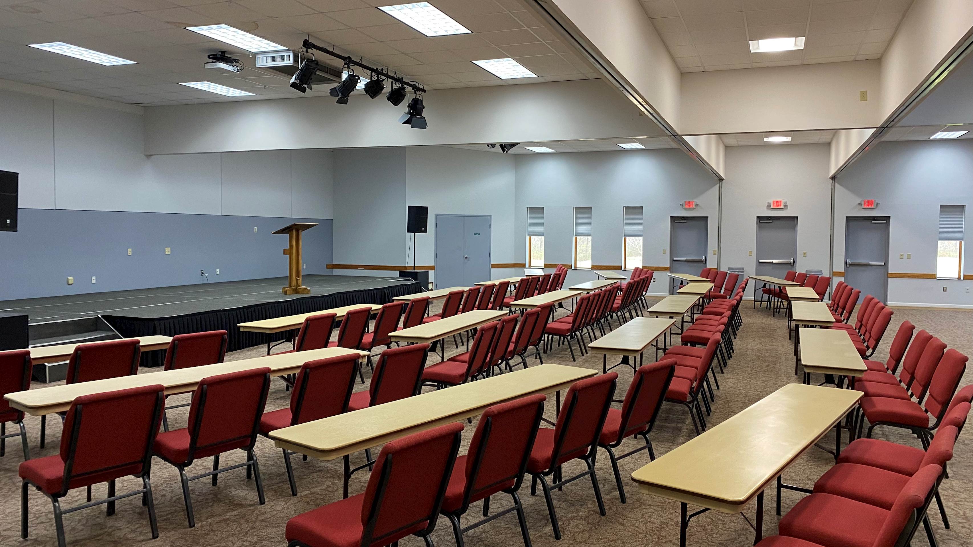 The Auditorium has a seating capacity of 1500 people; Lake Williamson’s largest meeting space. This space is very versatile with various chair/table and wall section combinations. Wall sections can be moved to offer the room divided down the middle as two rooms or with six breakout rooms (three on each side) with a long rectangular room in the center. There is also a newly built foyer, great for socializing between meetings or displaying exhibitors. Off the foyer is A7, which can hold up to 80 guests. A7 offers its own lavatory, counter top with sink and coffee maker, two wall mounted televisions, and a variety of seating styles. This space makes for a great camp office or child care room. The Auditorium is equipped with a booming sound system, stage lights, two platform televisions, two projectors and screens, and a lot of opportunity for creativity.