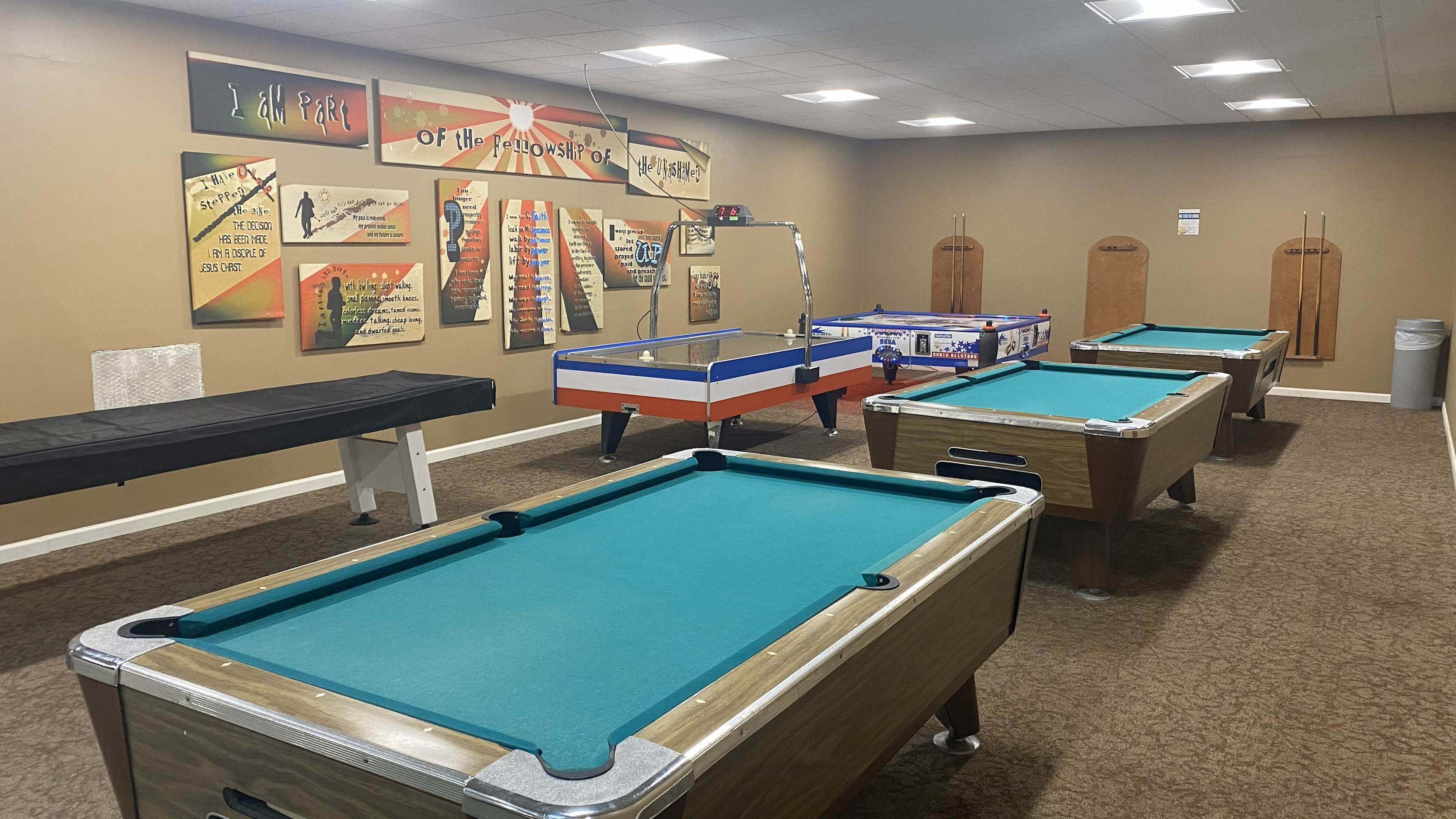 Indoor recreation activities are housed in the Activities Center. Available activities include basketball, volleyball, wallyball, dodgeball, 9 square, blacklight sports, billiards, table tennis, board games, and fitness center (for guests 18+)